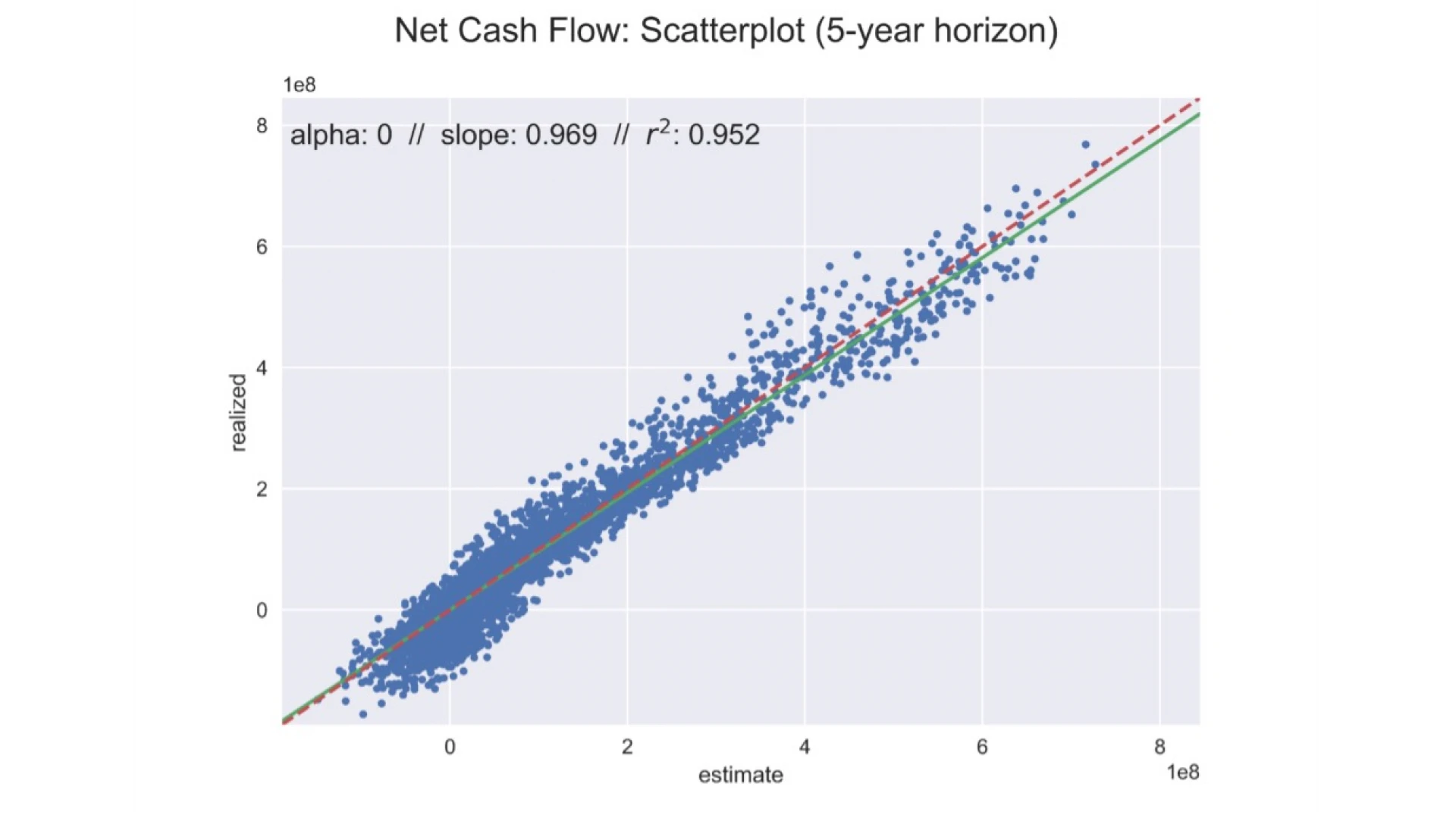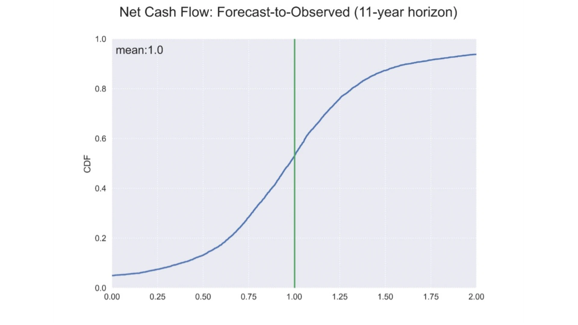 Figure 3 demonstrates that even for a 11-year horizon, the forecast model can produce unbiased NCF estimates as the forecast-to-observed ratio of the Net Cash Flow is on average exactly one.