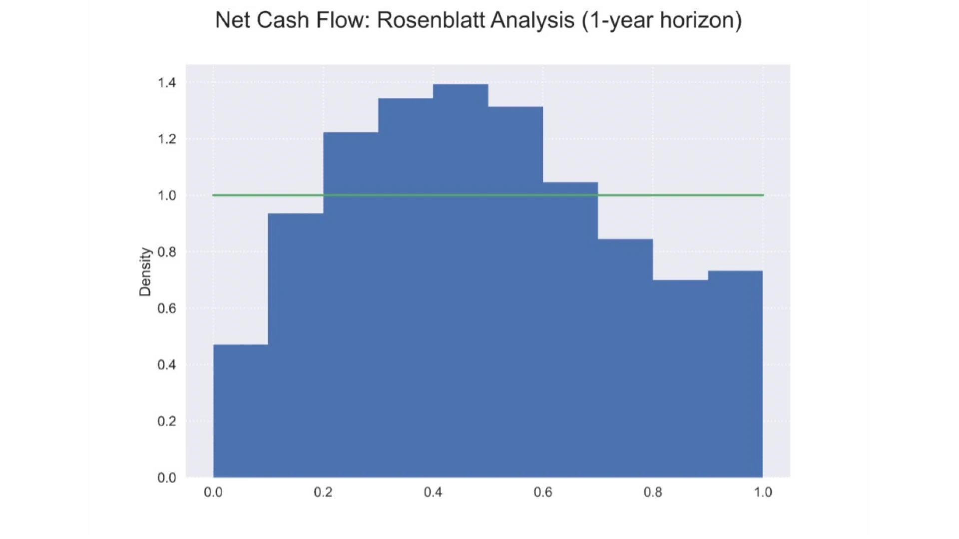 Figure 1 depicts a so-called Rosenblatt transformation analysis where we input the empirically realized values in the model-implied probability distribution to backtest our forecast probability bands. The transformed distribution should then come close to a uniform distribution if our model describes the empirical distribution of the NCF adequately [Rosenblatt, 1952]. Figure 1 illustrates that our model generally has probability bands that fit nicely (close to uniform) but are still conservatively calibrated (fewer tail observations); this holds for all KPIs and forecast horizons.